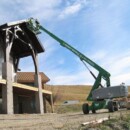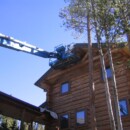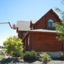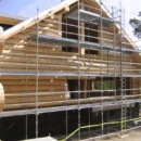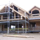 Safway® Systems™ scaffold erected Log-shell mechanically sanded with Mirka® Gold™ abrasive disks PPG® ProLuxe™ Cetol® Log and Siding coatings to be applied